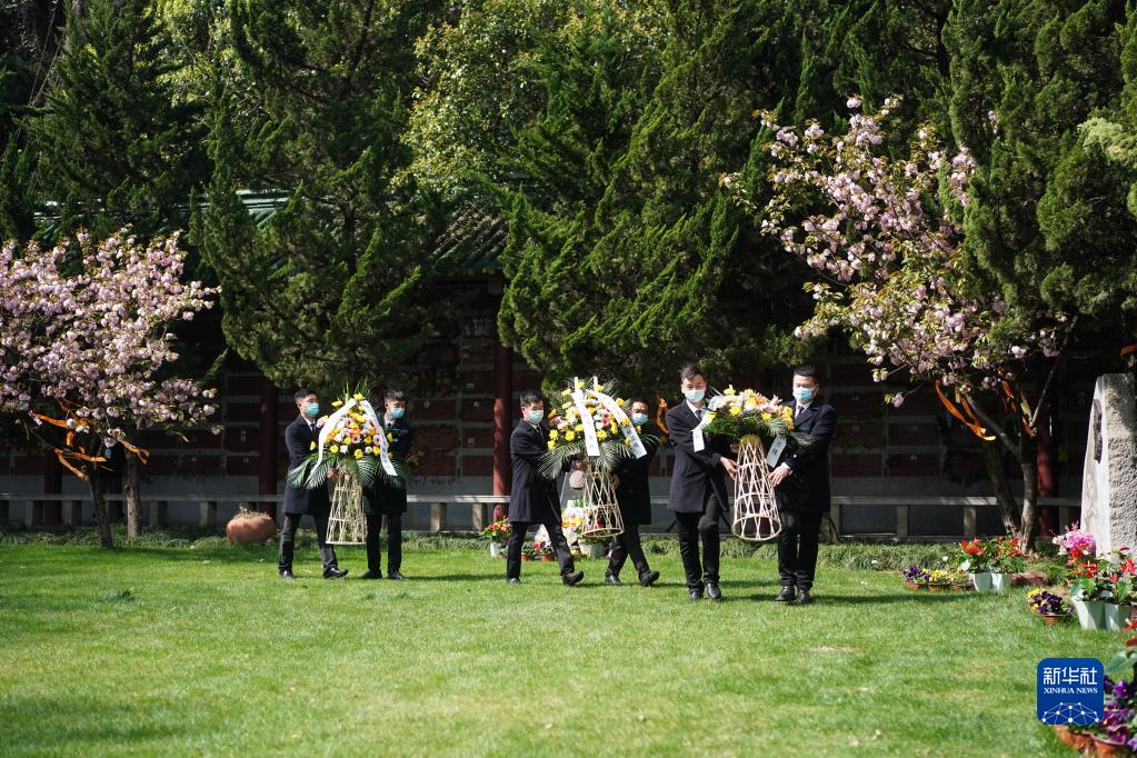 4月4日,在江苏省南京市雨花台功德园,工作人员向烈士献花。