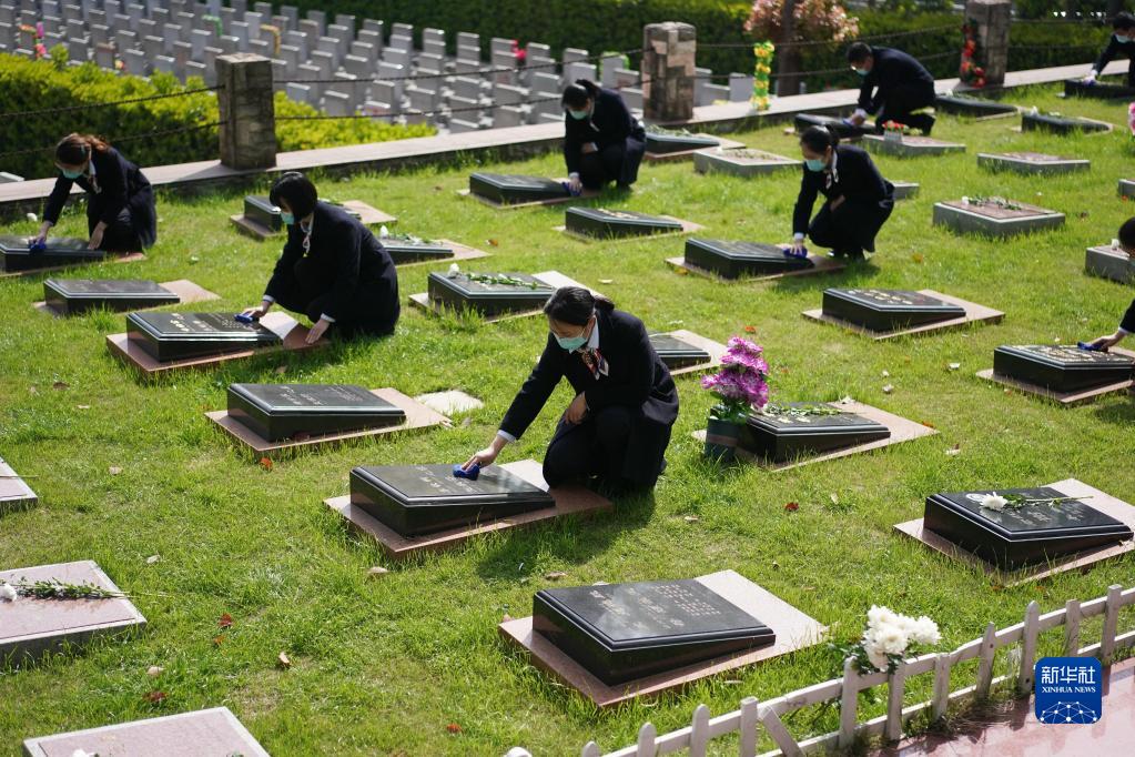 4月4日,在江苏省南京市雨花台功德园,工作人员在擦拭墓碑。