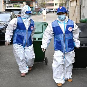 4月4日,在海口市琼山区一个封控居民小区内,志愿者清理垃圾。