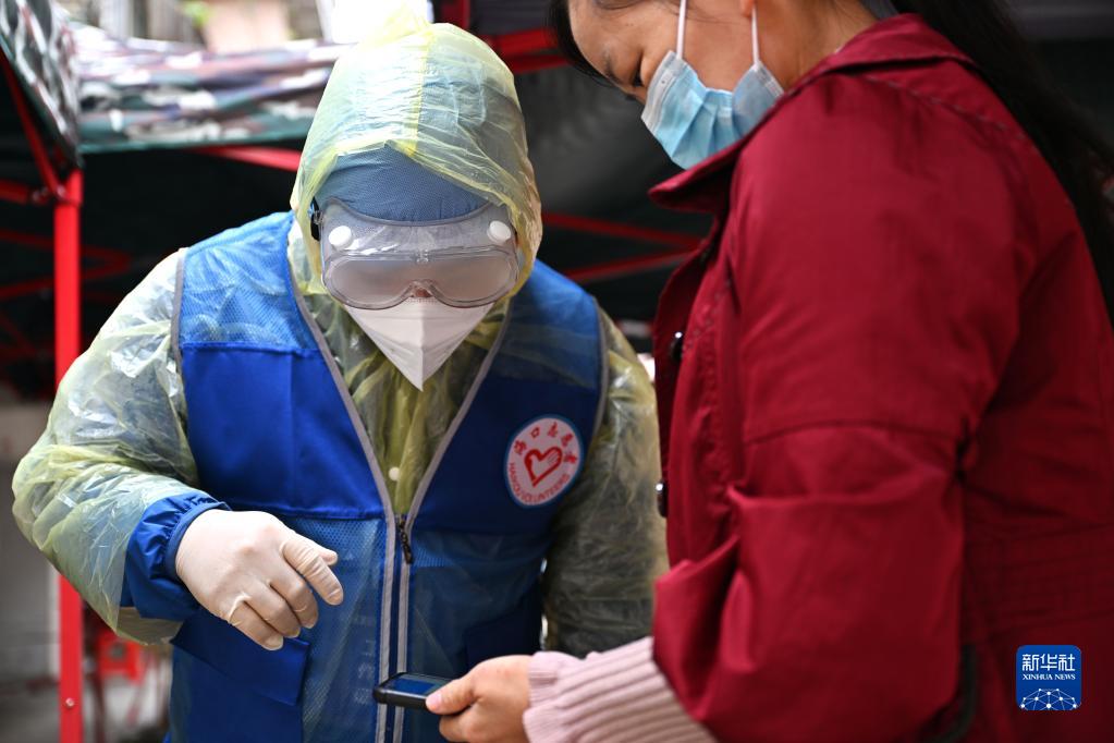 4月4日,在海口市琼山区一个封控居民小区内,志愿者引导居民进行核酸检测。