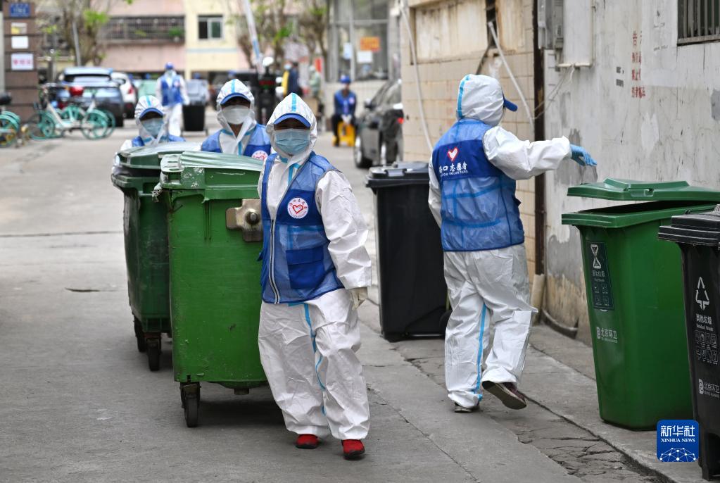 4月4日,在海口市琼山区一个封控居民小区内,志愿者清理垃圾。