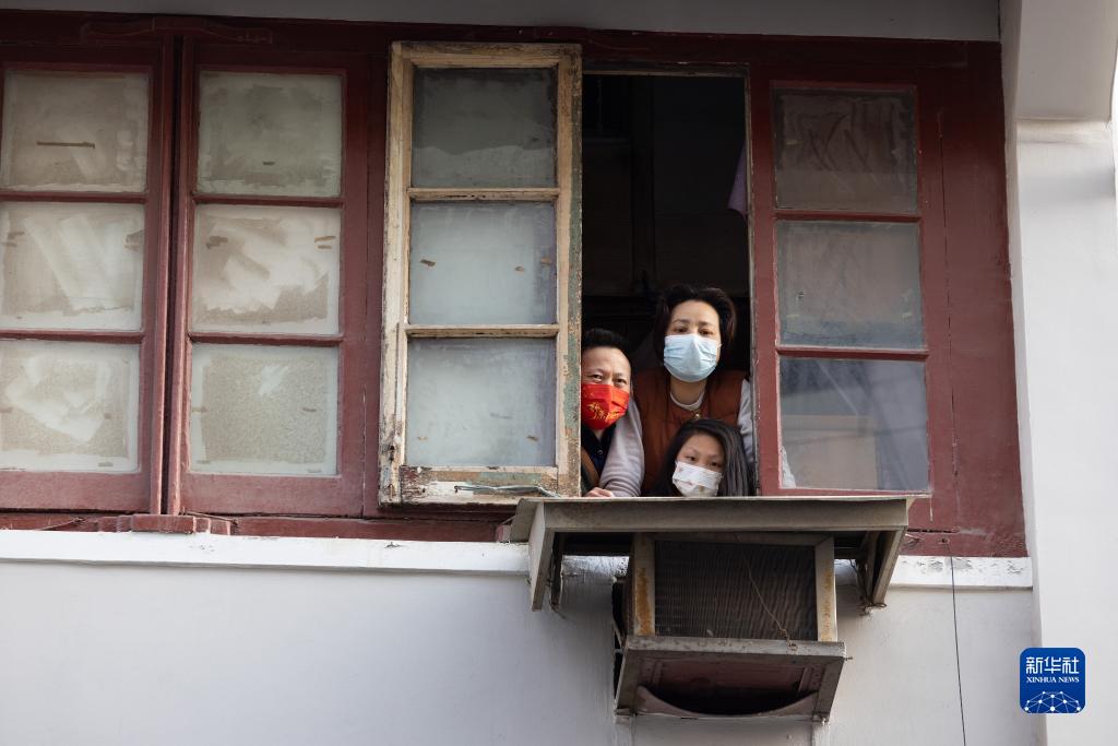 这是经营一楼上海特产便利店的龚文旭、梁修娟和10岁的女儿龚悦(4月3日摄)。
