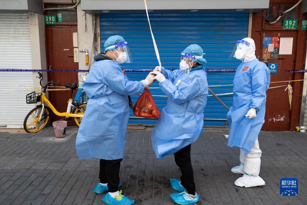 广福居委会工作人员王虹、陈艳、俞静芳(从左至右)在准备为居民递送水果(4月3日摄)。