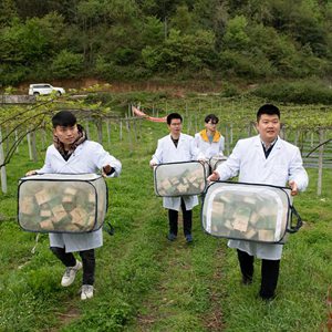 4月4日,在修文县谷堡镇平滩村猕猴桃种植基地,科技人员施放螳螂和小花蝽。