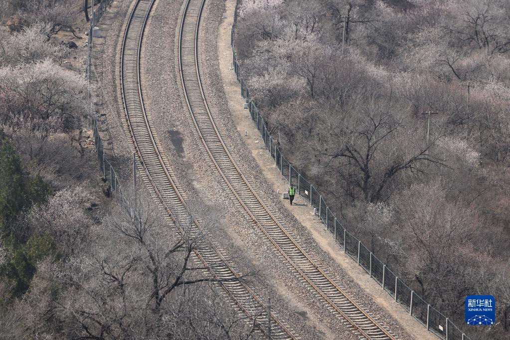 北京市郊铁路S2线的列车穿梭于居庸关长城脚下的花海,是春日里的一道风景。北京铁路公安处安排辖区民警加强值守,确保花海列车和游客的安全。