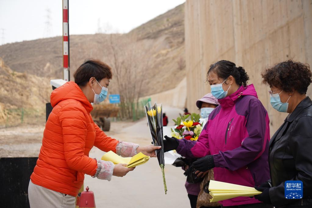 3月31日,在青海省西宁市城北区马坊街道盐庄村,村委会干部(左)用鲜花换取村民手中的纸钱,宣传文明祭扫。