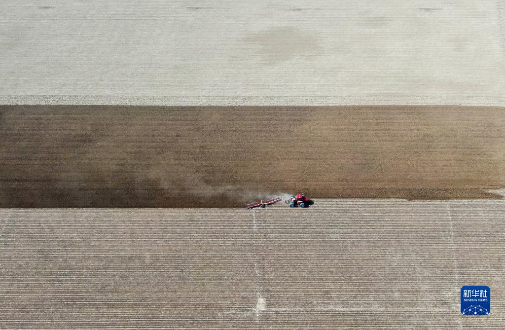 在新疆沙湾市一处棉田里,农民驾驶拖拉机犁地(4月2日摄,无人机照片)。