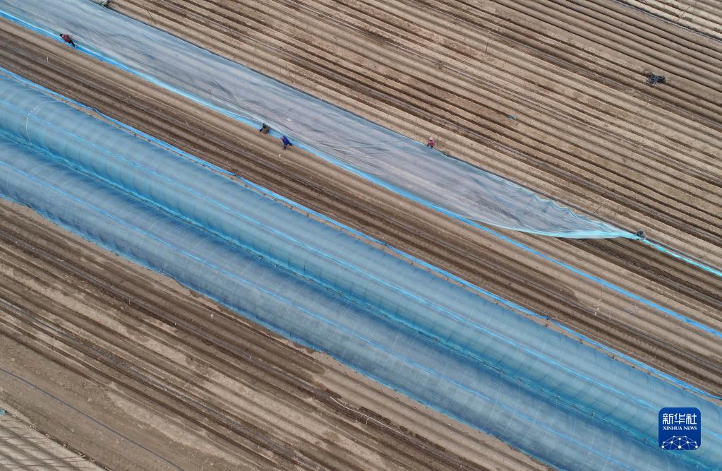 在河北省赵县韩村镇,农民在搭建姜棚(3月30日摄,无人机照片)。