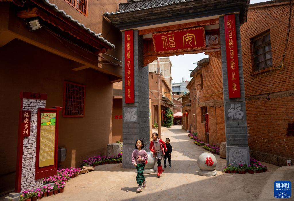 小朋友在昆明市晋宁区福安村里玩耍(4月4日摄)。