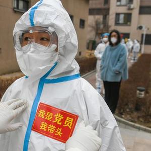 在长春市参与疫情防控的工作人员帮助同伴在防护服上粘贴“我是党员我带头”的标识(4月4日摄)。