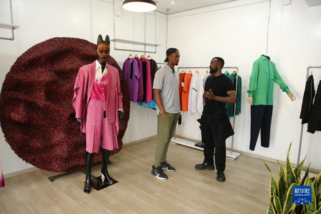 4月1日,在卢旺达首都基加利,Moshions品牌创始人摩西·图拉希尔瓦(右)在服装品牌店内与一位顾客交谈。新华社发(黄万晴摄)