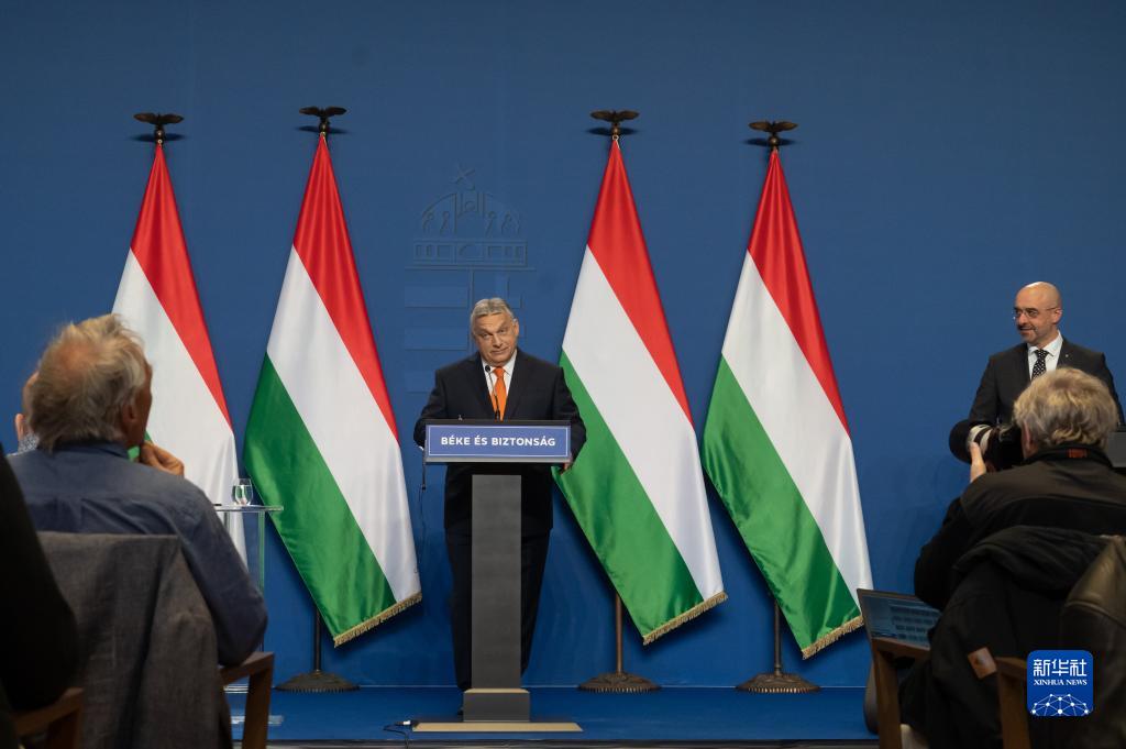 4月6日,匈牙利总理欧尔班(中)在首都布达佩斯举行国会选举后的首场记者会。