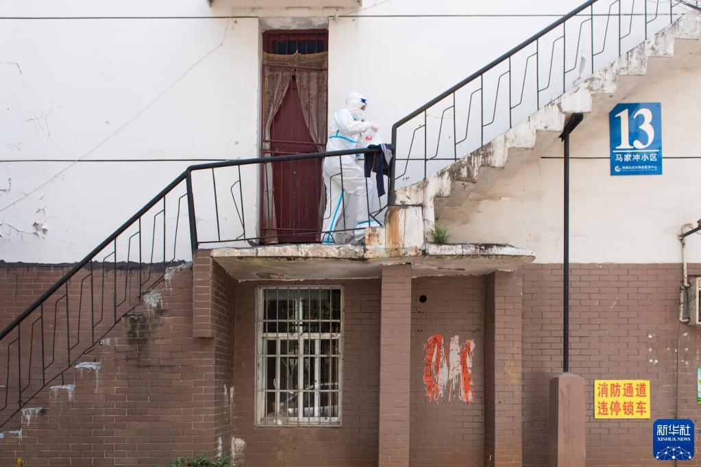 4月7日,在长沙市雨花区东塘街道枫树山社区马家冲小区,志愿者上门为居家隔离的居民配送物资。