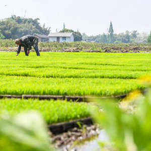 当下正逢春耕时节,位于四川省眉山市彭山区凤鸣街道金烛村田间成片秧盘里的秧苗已冒出新芽,村民们忙着进行除草等工作,为接下来的机械插秧做准备。