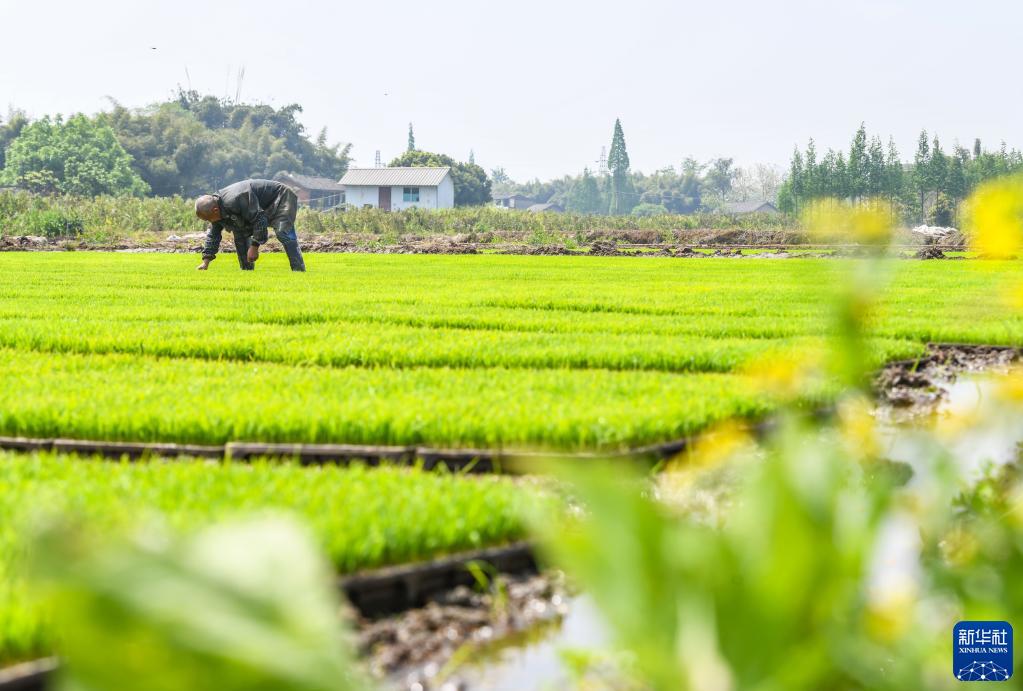 4月7日,在四川省眉山市彭山区凤鸣街道金烛村,村民在育秧田里除草。