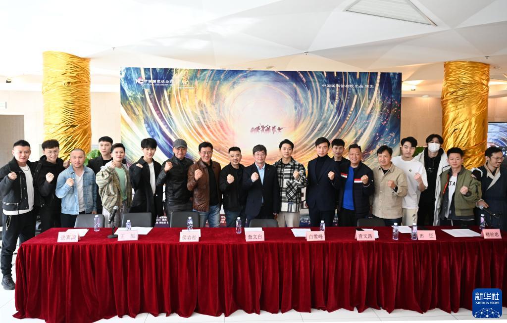 4月7日,话剧《铁流东进》主创在发布会现场合影。