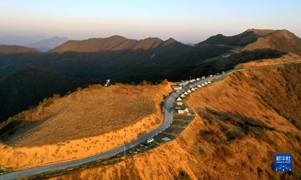 朝霞中的正阳草甸巴山一号露营地(4月8日摄,无人机照片)。