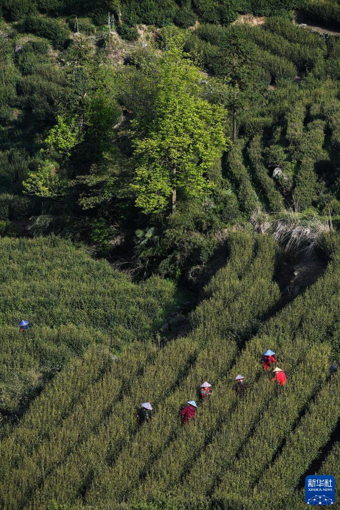 4月7日,茶农在里山镇安顶山上的高山云雾茶地里采摘春茶。