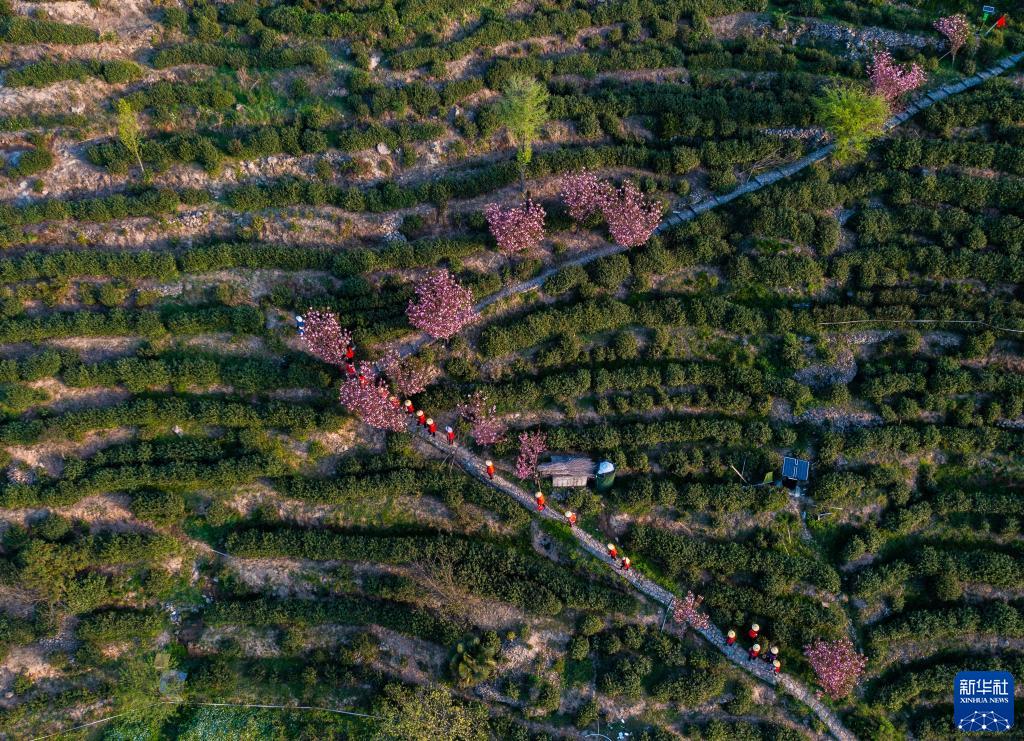 4月8日,茶农前往安顶山上的高山云雾茶地,准备开始采摘春茶(无人机照片)。
