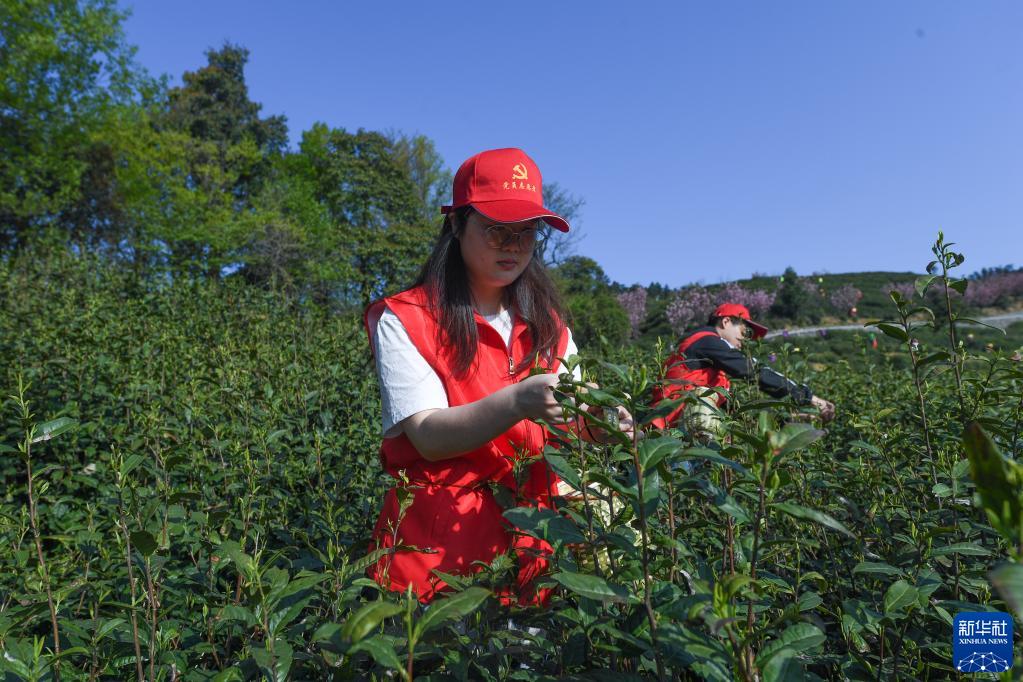 4月8日,在里山镇安顶山上的高山云雾茶地,党员志愿者帮助人手不足的茶农采收云雾茶。