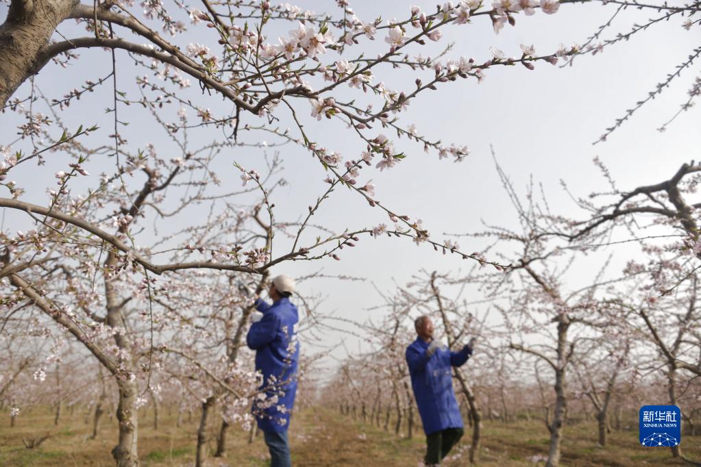 4月8日,果农在河北省保定市望都县八里庄村为桃树疏花。新华社发(陈卫红摄)