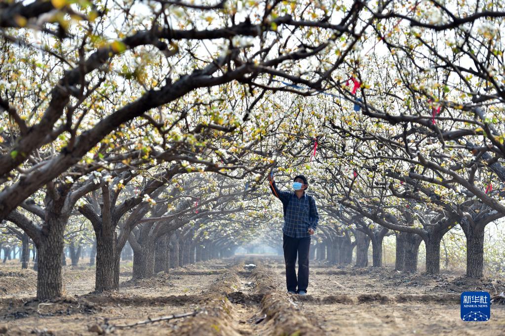 4月8日,在河北省石家庄市藁城区贾市庄镇张名甫村的梨园里,果农进行人工授粉作业。新华社发(张晓峰摄)
