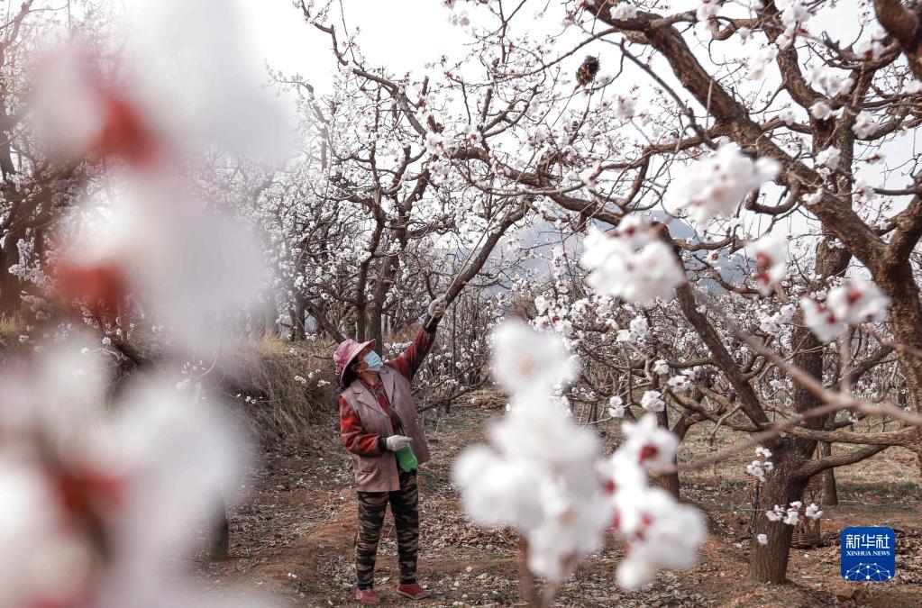 4月8日,农民在河北省遵化市娘娘庄乡相古庄村为杏花授粉。新华社发(刘满仓摄)