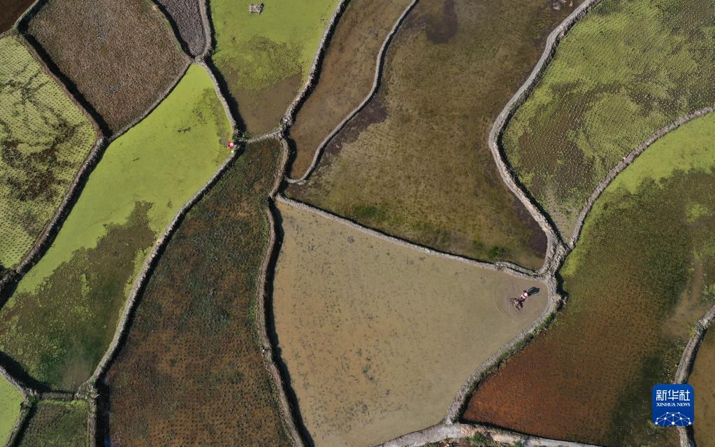 4月8日,贵州省黔东南苗族侗族自治州从江县刚边乡三联村村民在田间耕作(无人机照片)。新华社发(罗京来摄)