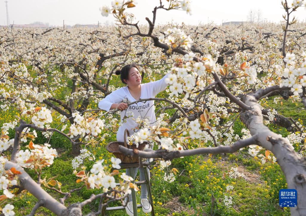 近日,河北省赵县的25万亩梨树陆续开花,当地果农抢抓农时,给梨树疏花授粉。