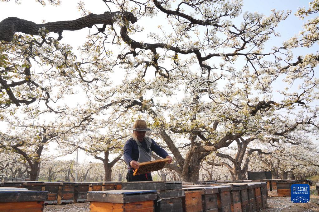 4月8日,蜂农在河北赵县范庄镇南庄村的梨园内工作,用传统蜜蜂授粉方式为梨花授粉。