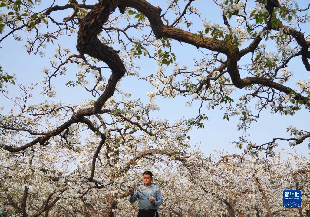 近日,河北省赵县的25万亩梨树陆续开花,当地果农抢抓农时,给梨树疏花授粉。