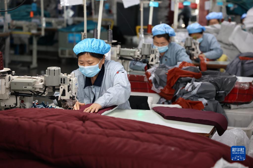 4月6日,工人在山东省滨州市一家企业生产车间内加紧生产供应上海的睡袋。