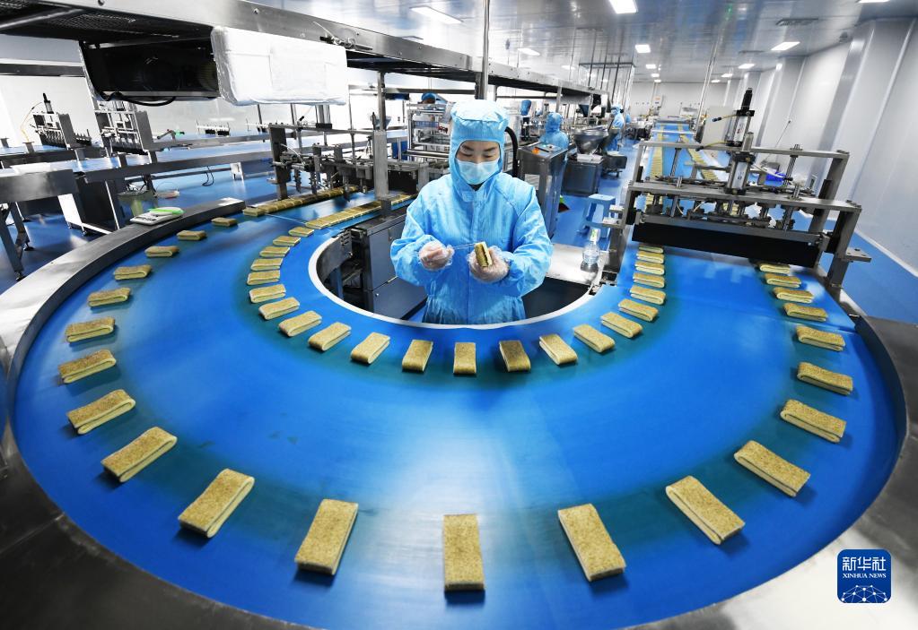 4月7日,山东省枣庄市山亭区一家企业员工在食品生产线上忙碌。