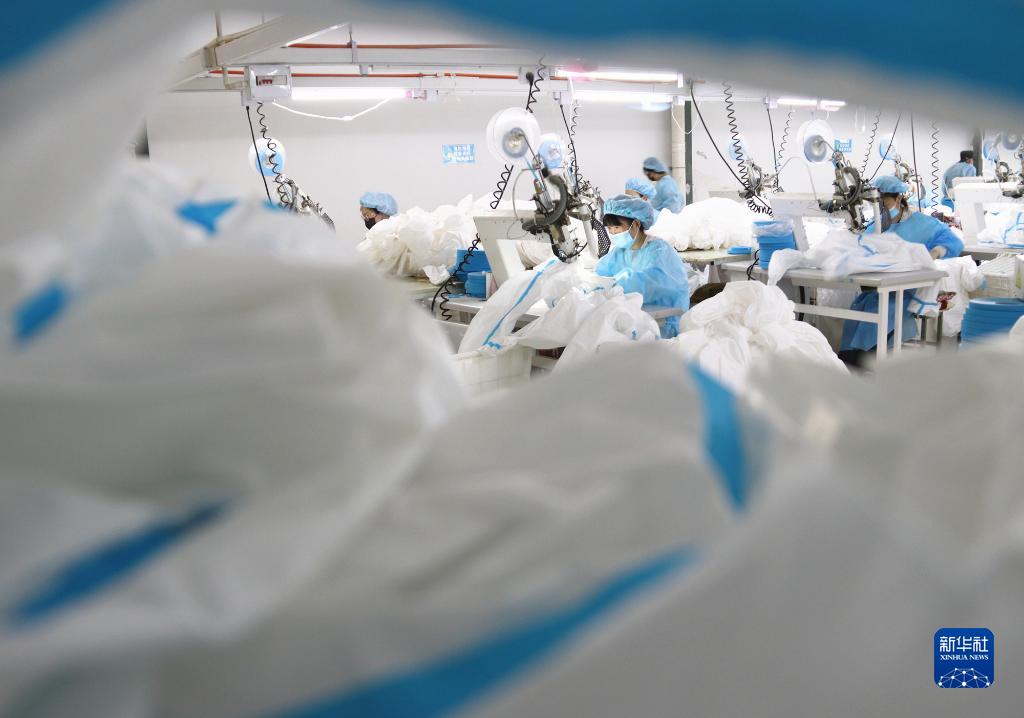 4月7日,在山东省菏泽市牡丹区高庄镇一家防护服生产企业,工人在缝制防护服。