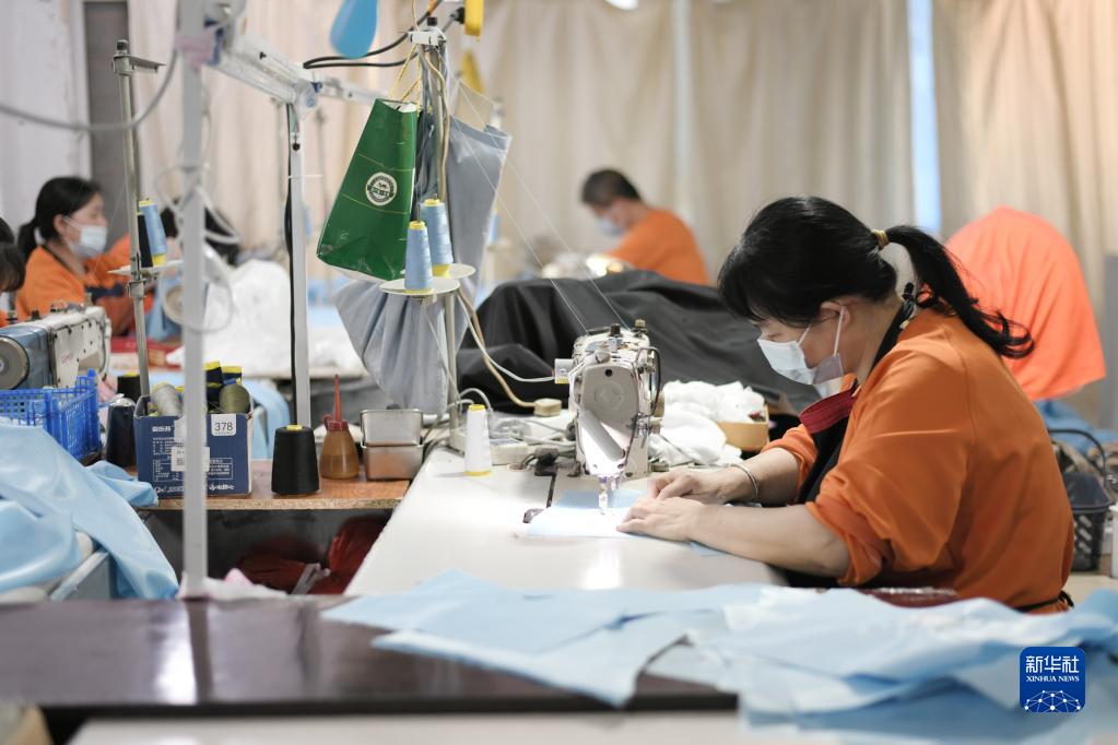 4月8日,工人在福建省福州市台江区一家服饰企业生产车间操作缝纫机。