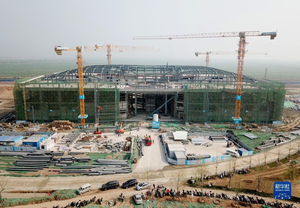4月8日,工人在第十二届江苏省园艺博览会主展馆云栖馆现场加紧施工(无人机照片)。