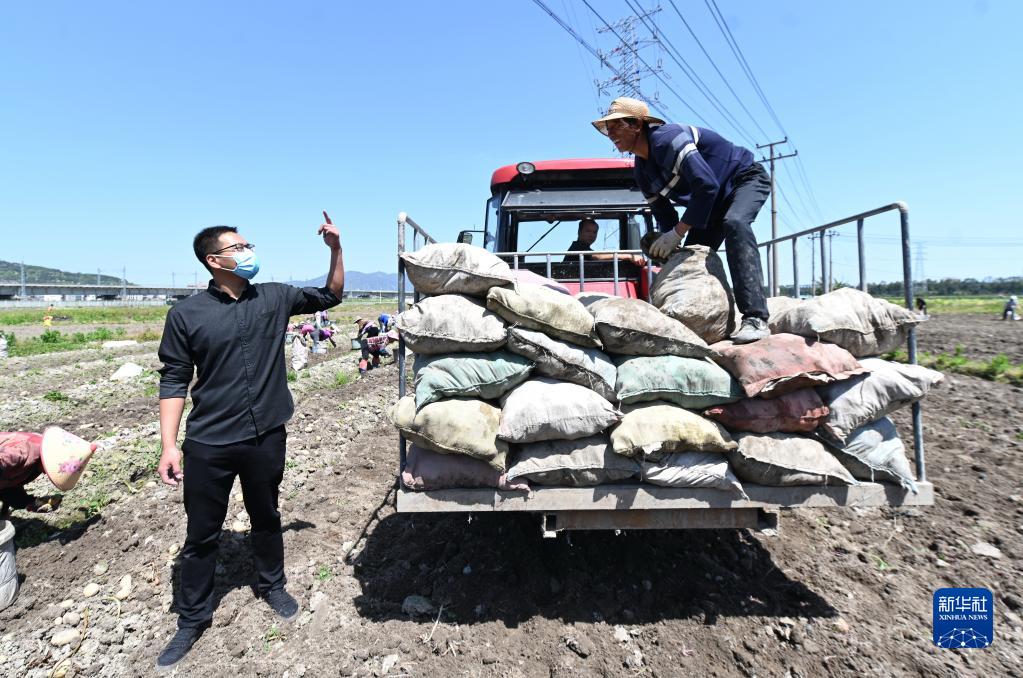 4月8日,陈颖(左)在石门村的一处马铃薯地里向工人了解采收情况。