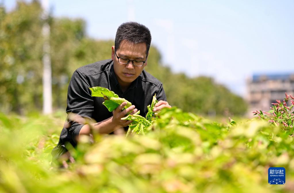 4月8日,陈颖在马铃薯地里查看病虫害的防治效果。