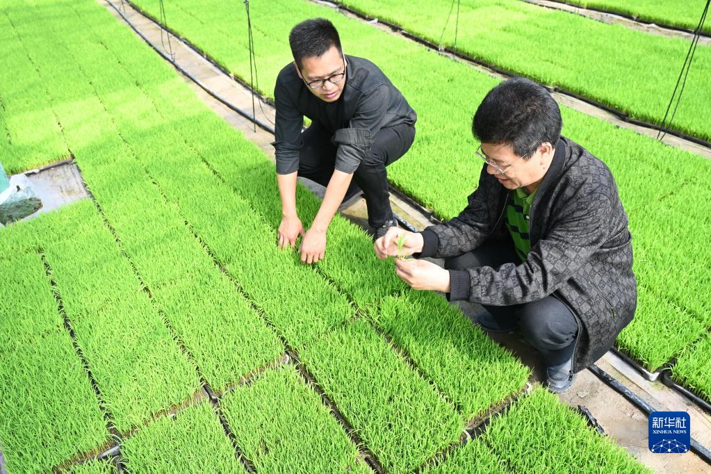 4月8日,陈颖(左)和父亲在水稻育秧棚里查看秧苗长势。