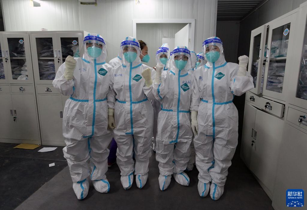 海南省援沪医疗队医护人员在入舱前加油鼓劲(4月8日摄)。