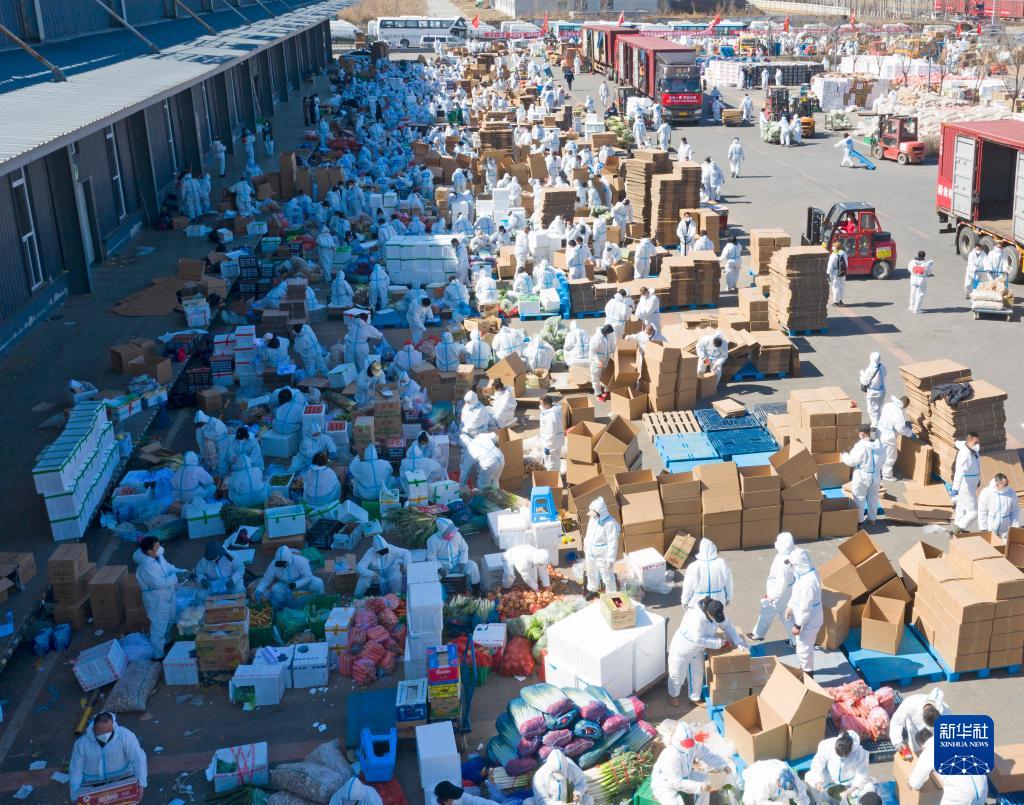 在中国供销农产品(沈阳)集配中心,沈抚新区机关干部和社区志愿者在分拣蔬菜(4月6日摄,无人机照片)。