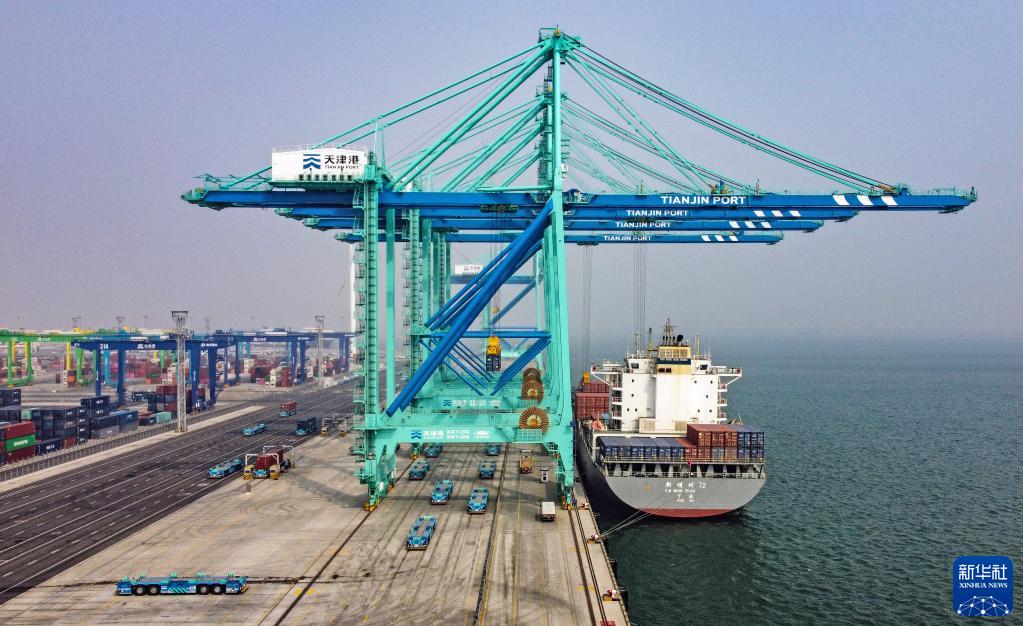 4月9日,一艘货轮停靠在天津港北疆港区C段智能化集装箱码头(无人机照片)。