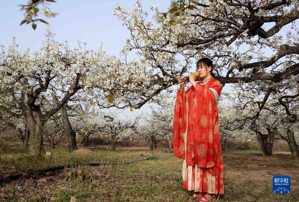 近日,河北省邢台市临城县北程村百年梨园的梨树进入盛花期,满园梨花竞相绽放。受近期疫情影响,梨园暂时未对公众开放。为满足人们赏花需求,景区组织工作人员在梨园内进行直播,邀请观众“云赏花”,让人们足不出户可以欣赏梨园的美丽风景。