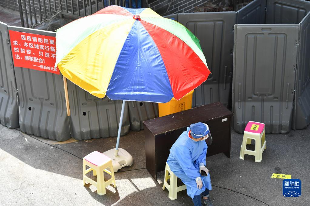 4月9日,在长沙市天心区城南路街道熙台岭社区,社区工作人员在工作间隙休息。