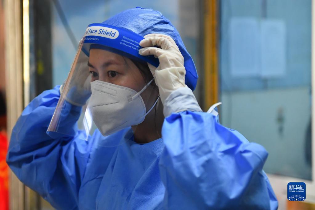 4月9日,在长沙市天心区城南路街道熙台岭社区,准备进入管控区的社区工作人员佩戴防护面罩。