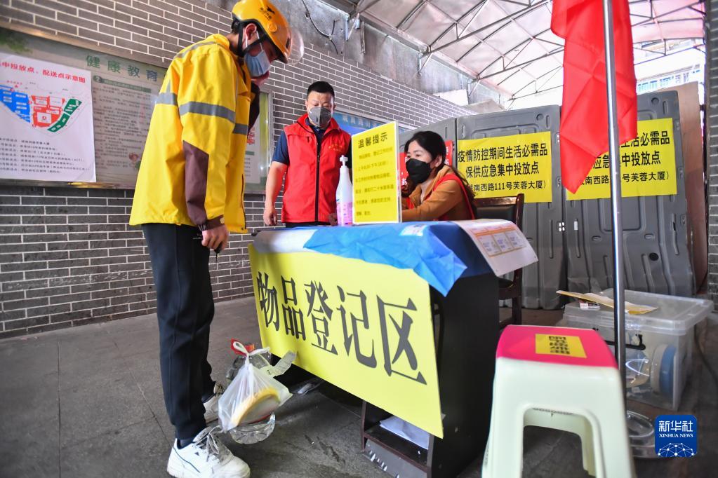 4月9日,在长沙市天心区城南路街道熙台岭社区的生活必需品集中投放点,志愿者登记需要投放的生活物资信息。