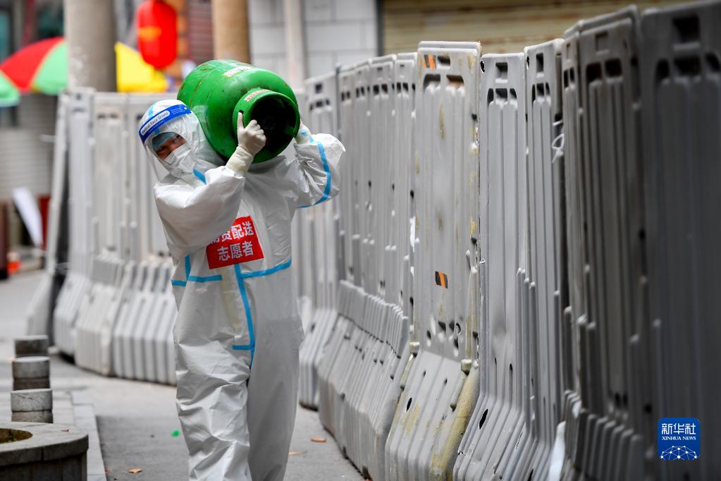 4月9日,在长沙市天心区城南路街道熙台岭社区,志愿者准备给封控区内的居民送液化气。