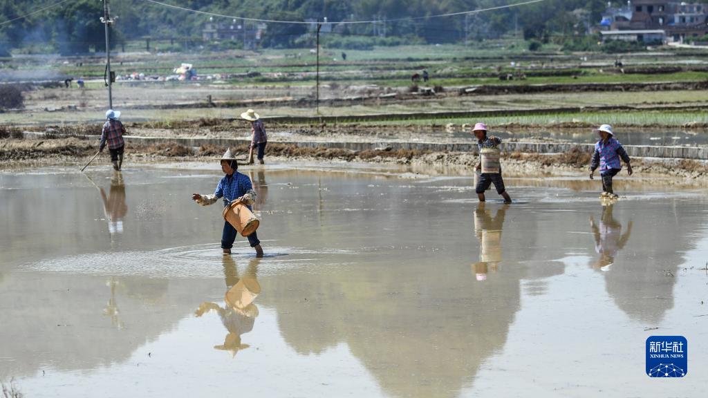 4月9日,在广西大化瑶族自治县大化镇龙口村,农民抢抓农时播种水稻秧苗。