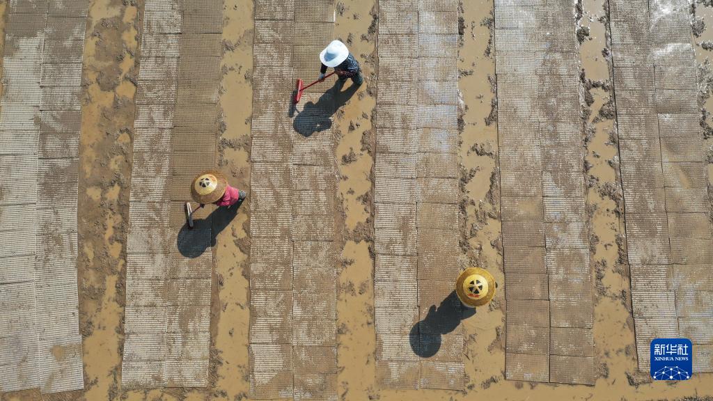 4月9日,在湖南省衡阳市常宁市洋泉镇坦冲村,村民在整理水稻秧田(无人机照片)。
