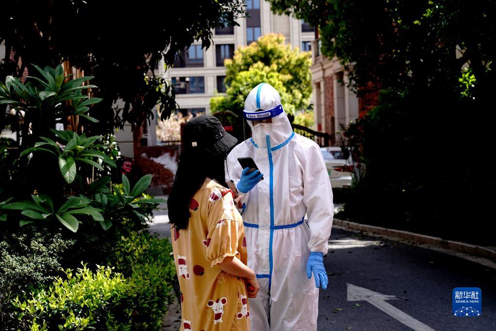 4月9日,在上海松江区中海悦庭小区,洞泾镇社区卫生服务中心医务人员为居民进行核酸采样扫码登记。